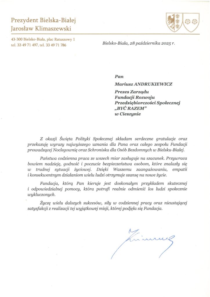 28 października 2025 r. w Bielsku-Białej podczas uroczystej gali Fundacja Rozwoju Przedsiębiorczości Społecznej „Być Razem” wraz z całym zespołem pracowników Noclegowni i Schroniska dla Osób Bezdomnych w Bielsku-Białej otrzymała z rąk Zastępcy Prezydenta Pana Adama Ruśniaka gratulacje i podziękowania za pełną zaangażowania pracę na rzecz osób w kryzysie bezdomności. List gratulacyjny otrzymał Prezes Zarządu Fundacji Pan Mariusz Andrukiewicz. Ponadto Pani Violetta Mencel, będąca długoletnim opiekunem w Schronisku dla Osób Bezdomnych, otrzymała szczególne podziękowania za zaangażowanie, profesjonalizm oraz wzorowe wykonywanie powierzonych obowiązków.